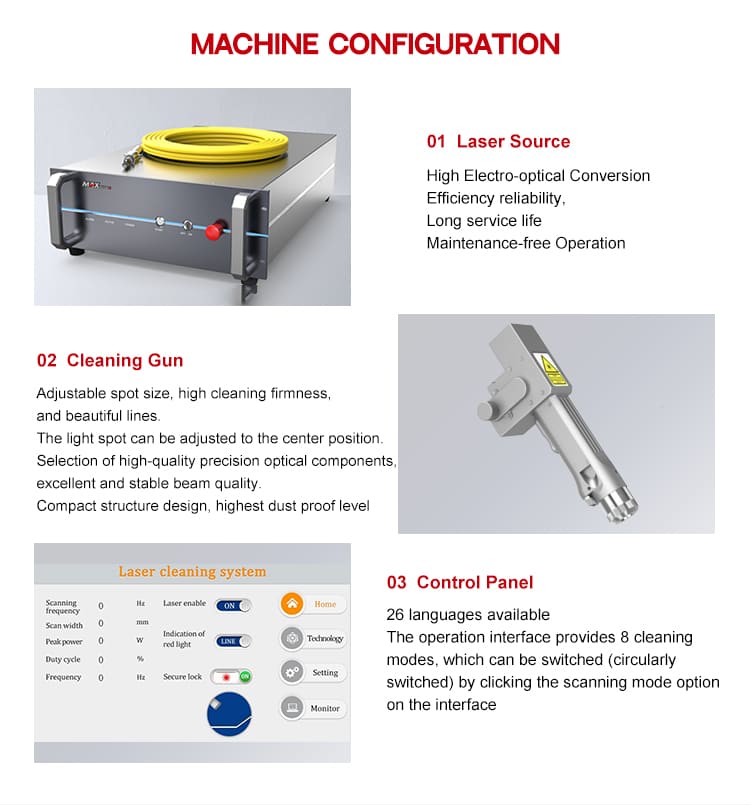 Jako bezkontaktní laserový čisticí stroj nepoškozuje substrát dílů, žádné spotřební materiály nešetří energii a ochranu životního prostředí a dokáže účinně odstraňovat pryskyřici, olej, skvrny, špínu/rez, povlaky, povlaky a barvy z povrchu obrobku, aby splnil požadavky na čištění na komplexní modelování a jemné polohování v oblasti průmyslového zpracování, dosáhl vyššího stupně čistoty čisticího efektu a výrobních výhod při nižších komplexních nákladech.