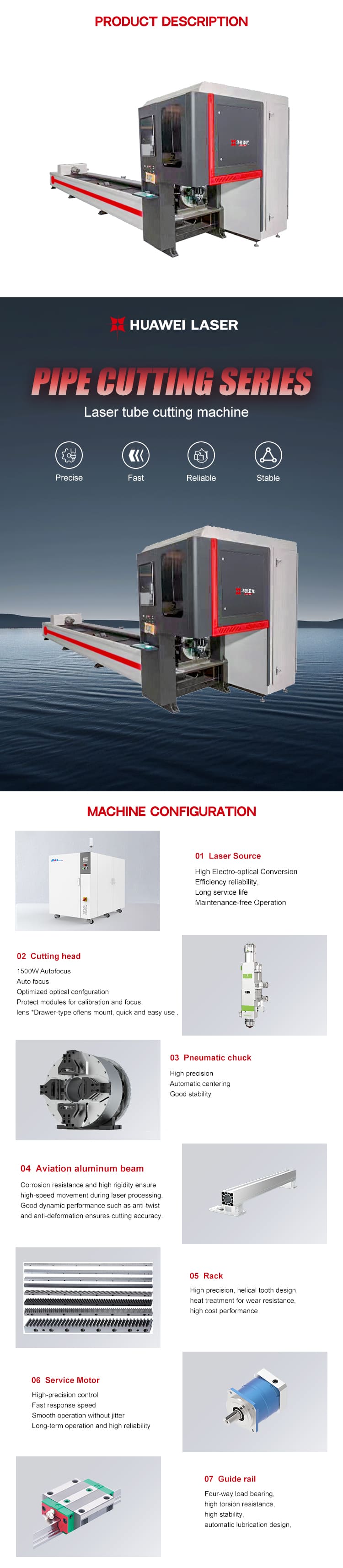 Vysoce přesný laserový řezací stroj na trubky s dvojitým sklíčidlem HUAWEI LASER 6000W je navržen pro efektivní a přesné zpracování kulatých, čtvercových a nepravidelných kovových trubek. Jeho systém dvojitého sklíčidla zajišťuje stabilní upnutí, minimální vibrace a přesné otáčení při vysokorychlostním řezání. Je vybaven vysoce výkonným vláknovým laserovým zdrojem a inteligentním řídicím softwarem, poskytuje čisté řezy, hladké hrany a vynikající opakovatelnost. Laserový řezací stroj s dvojitým sklíčidlem na trubky HUAWEI LASER je pokročilá alternativa ručního laserového svařovacího stroje navržená speciálně pro vysoce účinné zpracování trubek a trubek. Je vybaven dvojitým pneumatickým sklíčidlem, zajišťuje stabilní upnutí, automatické centrování a přesné otáčení pro hladké a přesné řezy na kulatých, čtvercových a nepravidelných kovových trubkách. Jeho vysoce výkonný vláknový laserový zdroj poskytuje vysokou rychlost řezání, čisté hrany a minimální tepelnou deformaci. Systém pro řezání trubek HUAWEI LASER, navržený pro kovovýrobu, výrobu nábytku, výrobu fitness vybavení a automobilových komponent, poskytuje vynikající přesnost, spolehlivost a produktivitu pro moderní průmyslové aplikace. Tento stroj podporuje automatické nakládání, optimalizované dráhy řezání a rychlé přepínání materiálu, díky čemuž je ideální pro výrobu nábytku, fitness vybavení, stavebních trubek a zakázkovou kovovýrobu. Poskytuje vysokou spolehlivost a konzistentní produktivitu pro aplikace na zpracování trubek.