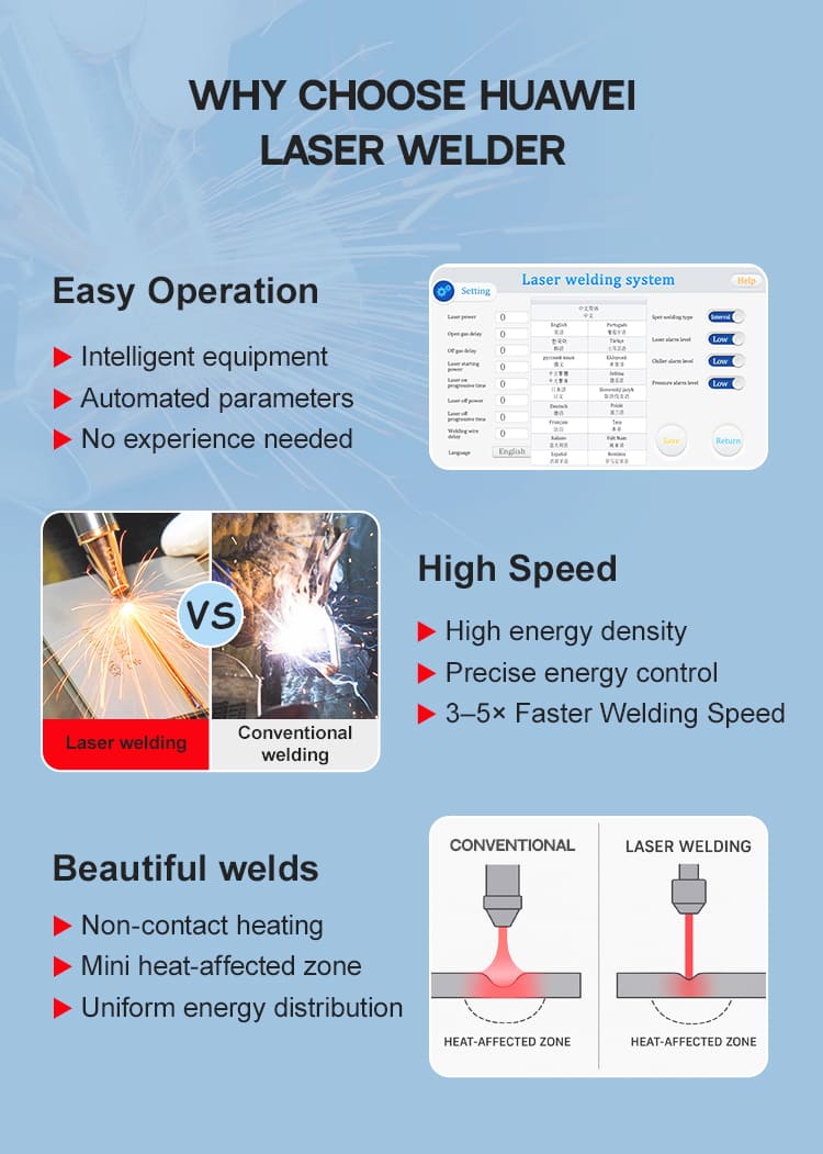 4. Snadné ovládání a učení: Obsluha ručního laserového svařování je jednoduchá a snadno se učí, šetří náklady na pracovní sílu a je vhodná pro rychlé školení a indukci.
